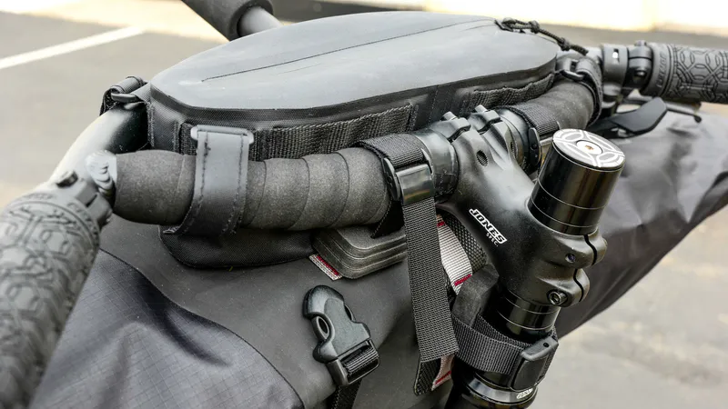 The H-Bar Pack is designed specifically for the Jones Loop H-Bars, and it's a great little pack! The low profile of the pack keeps it from interfering with the wide range of hand positions available on the H-Bars, and it even has a small cutout at each end to allow room for your thumbs next to the pack! Of the pack's effect on hand positions, Jeff says "With the new pack I still have all the hand positions I normally use if it is not fully stuffed and if I just use the four main straps. If it is stuffed full or if I use the extra straps, then I can't grip around bar next to the stem but I don't do that much anyway. The pack itself is nice to rest on with open hands and it supports my forearms when in the aero position like a little padded hammock."