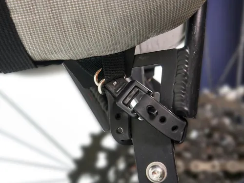 The devil is in the details on our rack attachment system. Although simple in concept, the tight spacing between the aluminum loop and strap prevents slop at the pannier rails. A bomber Voile nano strap with metal hardware provides tension at the bottom and gives versatility in mounting.