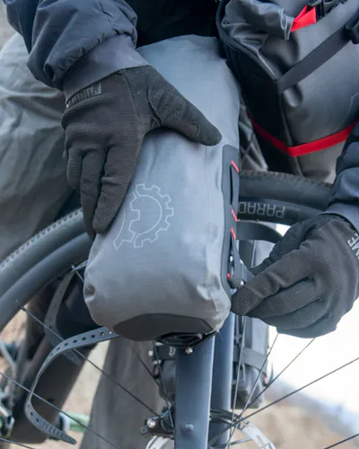 Low profile, side-mounted strap guides provide secure mounting. The bag’s D shaped bottom puts the curved part of the bag next to the cage and gives a front a flat, low profile face. Strategic Hypalon reinforcements protect against wear from cages. Pair it with our Tarsier Cargo Cage for a complete carrying system.