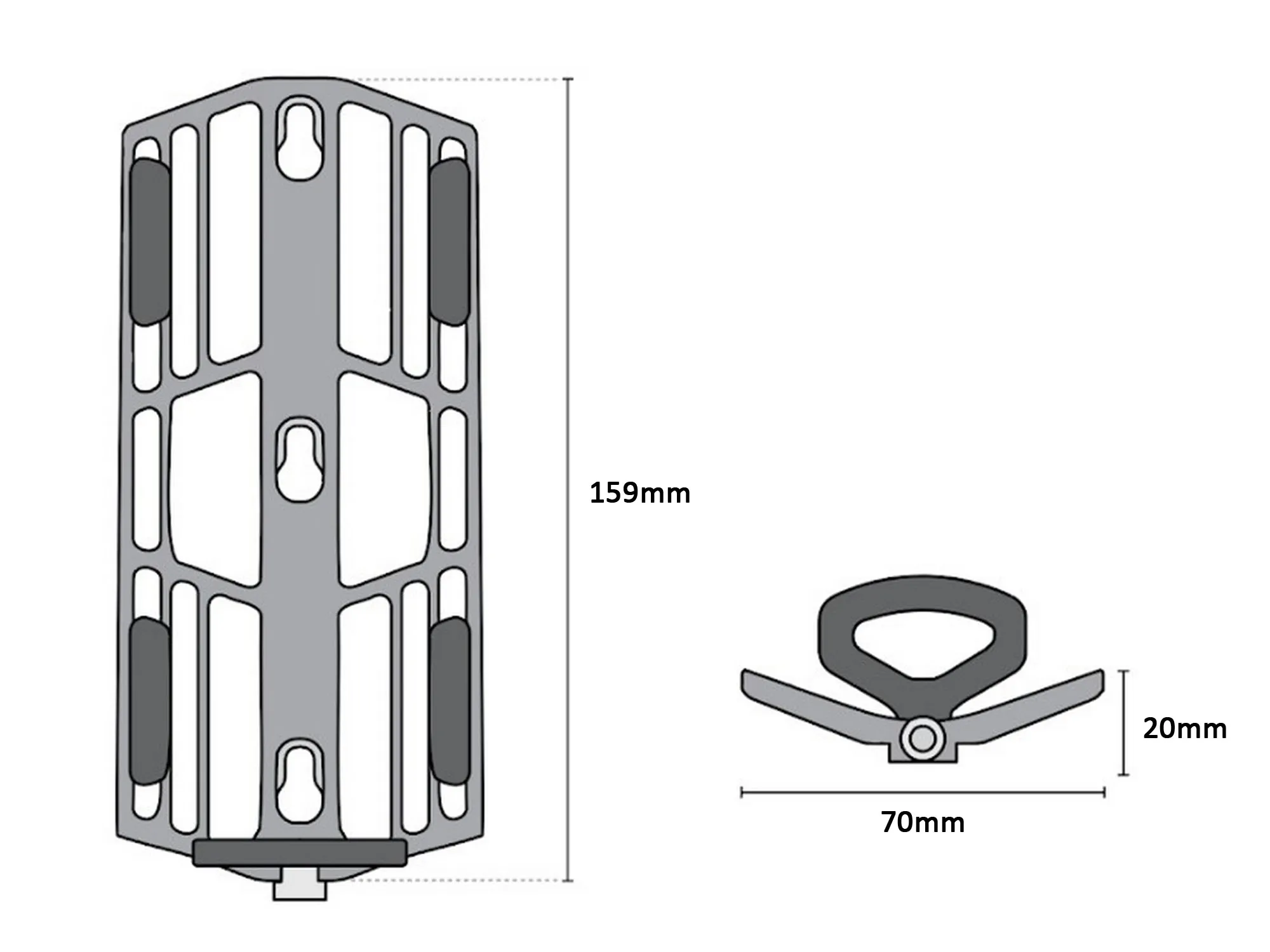 - Dimensions: Height 159mm, width 70mm, depth 20mm, foot extends 15mm for total depth 35mm