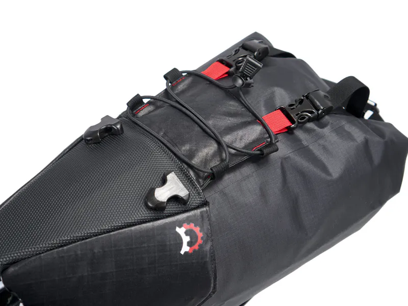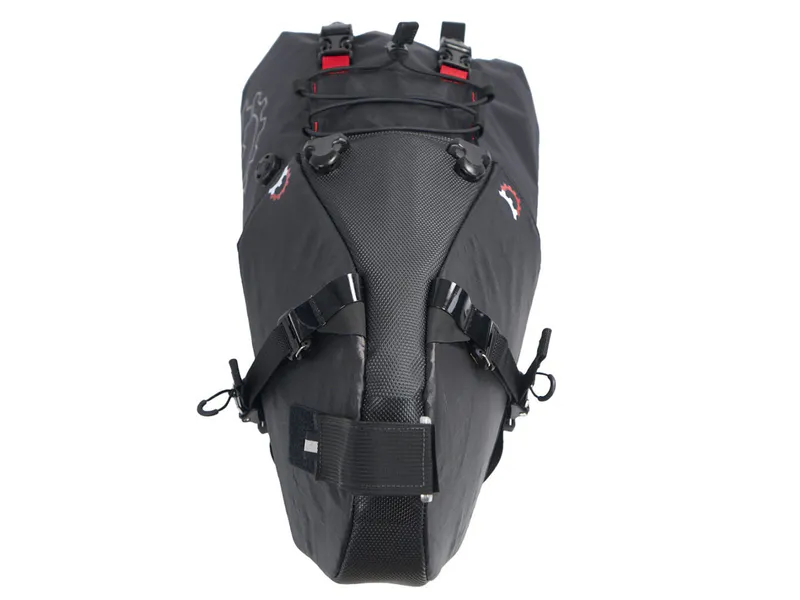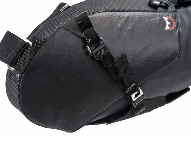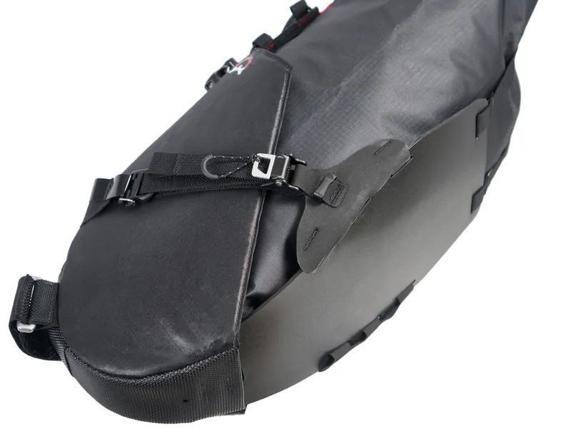 The Terrapin features an external plastic bottom sheet which acts as a fender to protect the bottom of the bag from kicked up debris. Stiffened on all sides, a composite internal top sheet provides a solid and stable platform for the strap points and transmits the vertical load to the seatpost connection. An external webbing and loop system houses a bungee and provides additional easy access external storage.